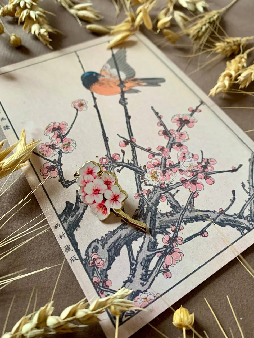 Металевий значок для одягу з зображенням молодої особини грака (Corvus frugilegus juv.) в оточенні квітів троянд